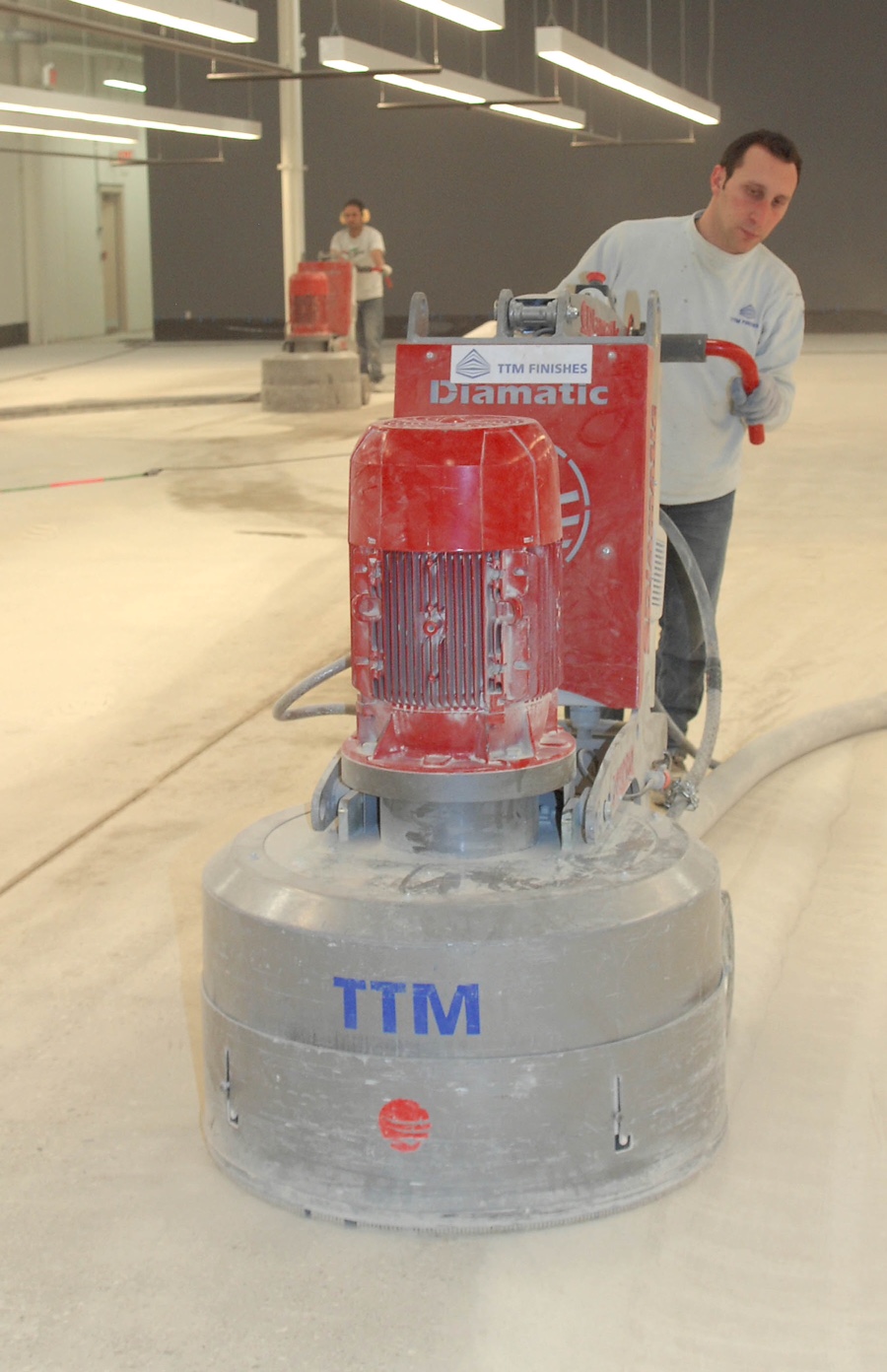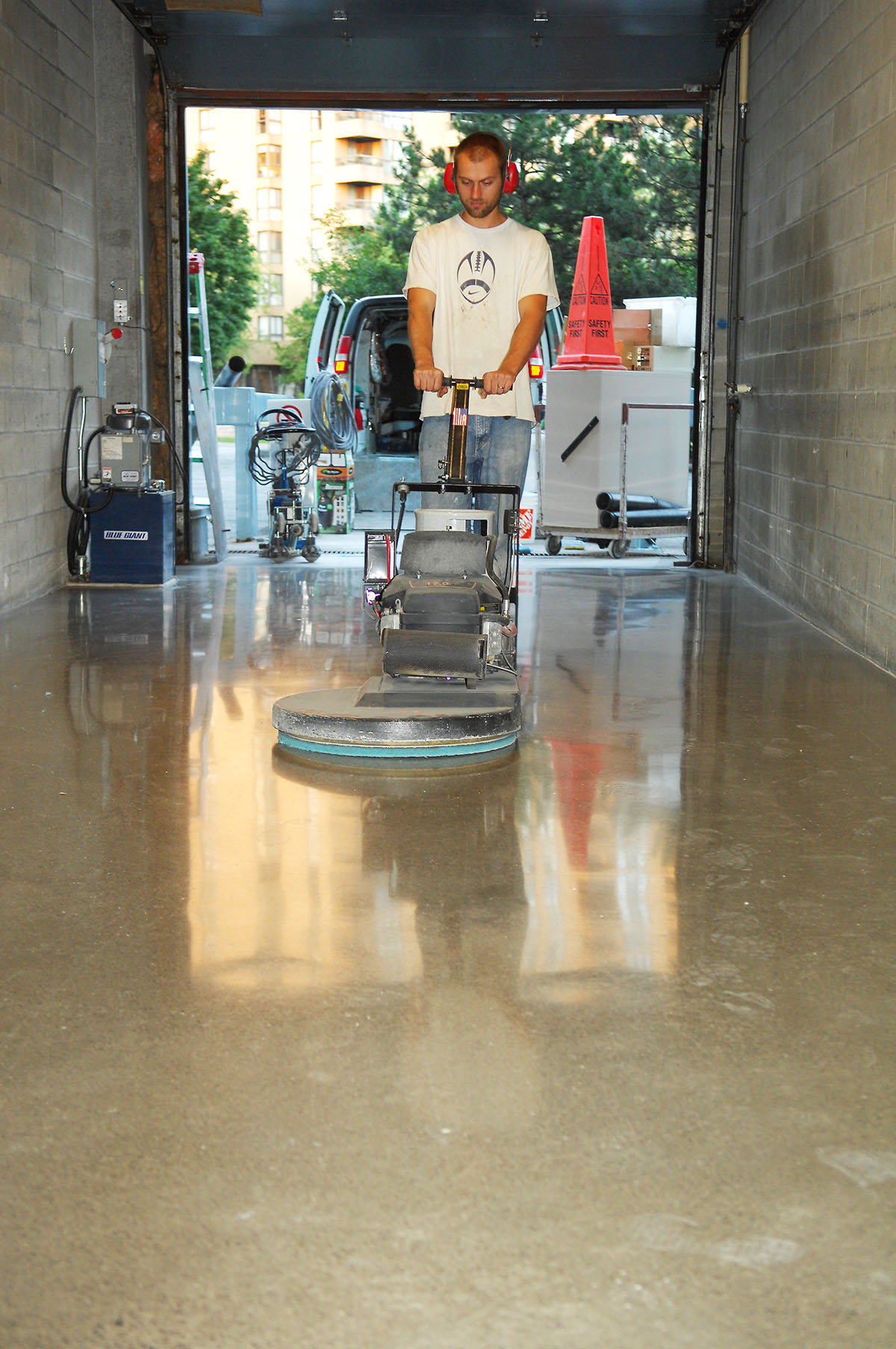 - Polishing the concrete starting with the highest level grit and ending up with the smoother level